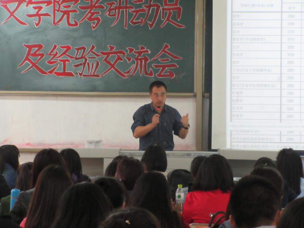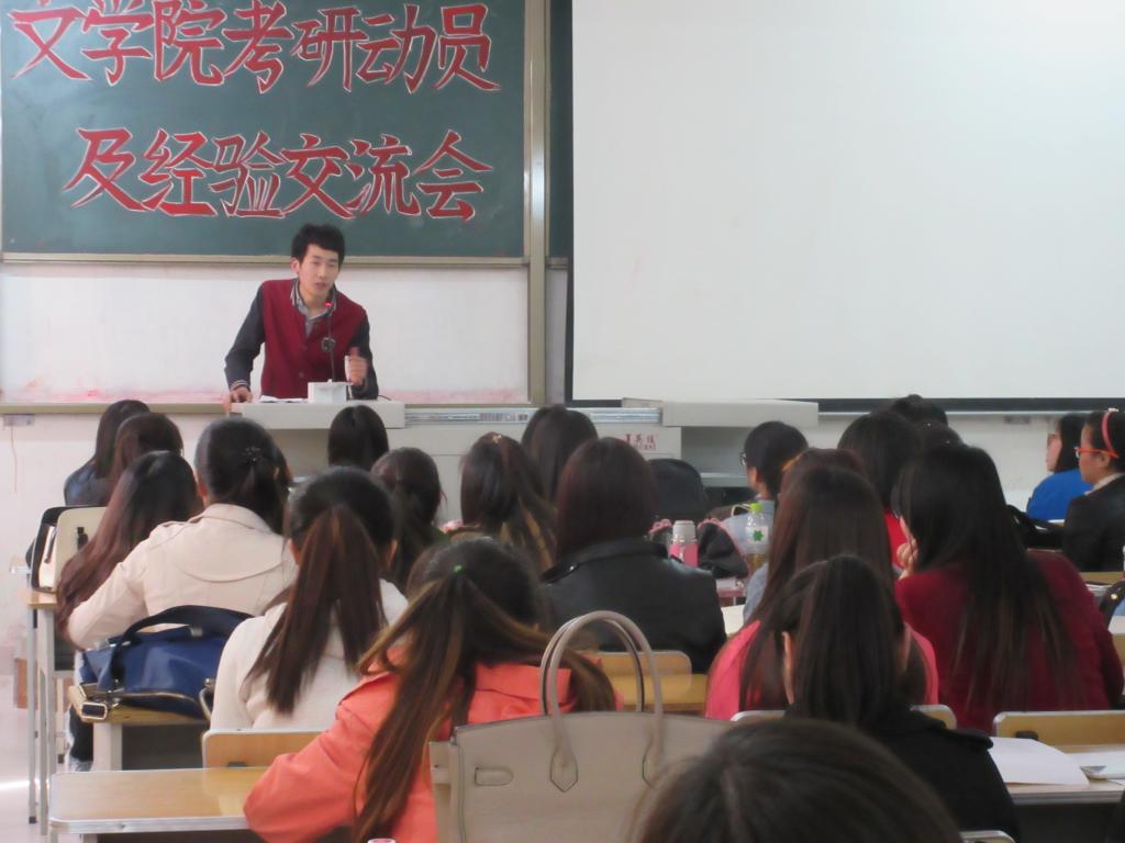 2015年4月22日下午,今年会官方网站考研动员会暨经验交流会在001教室顺利召开。今年会官方网站2012级全体学生以及2013级、2014级部分有考研意愿的同学参加了此次交流会。