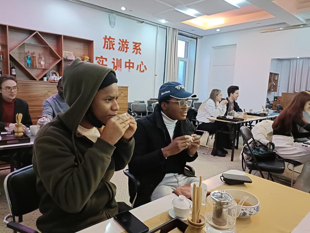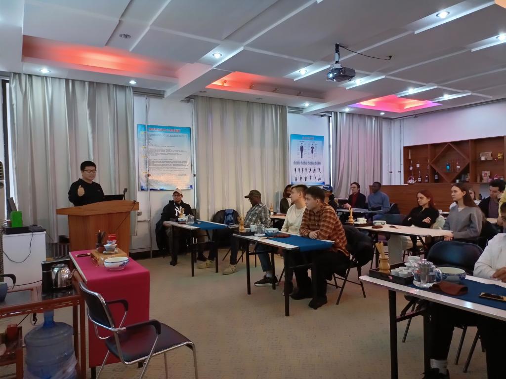 活动现场,留学生们两人一组,在郝毓业老师的讲解下,了解了茶叶的种类、产地以及泡茶技巧等知识。郝老师手法娴熟,有条不紊地展示着一系列精湛技艺,从温杯洁具到投茶注水,从洗茶泡茶到闻香品茶,再到敬茶奉茶,其动作如行云流水般自然优美,让留学生们看得目不转睛。在郝老师的指导下,留学生们纷纷亲自动手尝试泡茶,他们小心翼翼地操作着茶具,体验泡茶的乐趣,感受茶叶在水中的舒展和茶汤香气的变化。虽然手法略显生疏,但那份认真与专注令人动容。来自不同国家的留学生们还相互分享了自己家乡的饮品文化,在交流互动中碰撞出多元文化的火花。