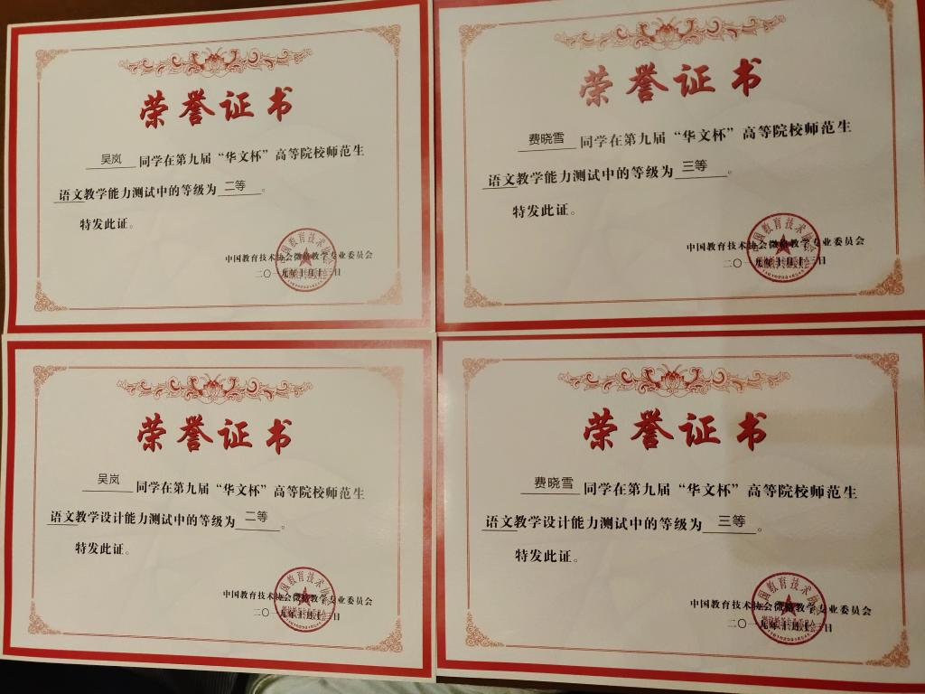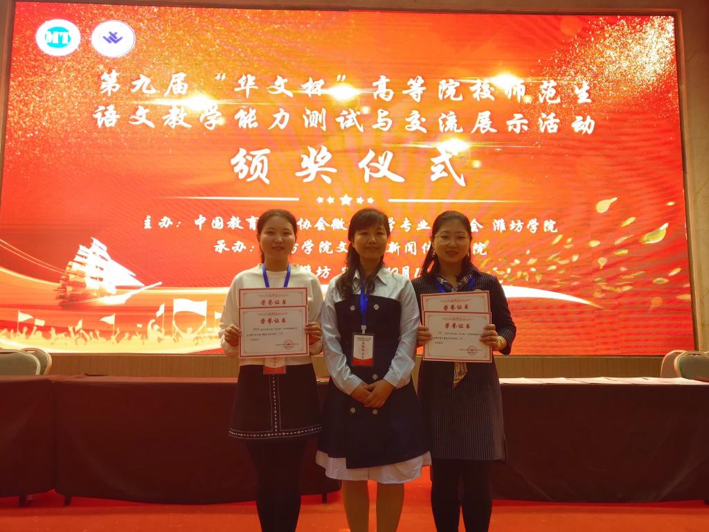 本次大赛,今年会选出2016级汉语言文学专业学生吴岚和费晓雪参加,指导教师徐晶、孙玉红。本次比赛汇聚了包括江西师范大学、广西师范大学、福建师范大学、哈尔滨师范大学、南京晓庄学院等全国92所高校的498名选手参赛。本科生和硕士研究生共同参加,同台竞技。2名参赛选手赛前积极准备,参赛过程发挥稳定,获得佳绩。最终,吴岚获得教学设计二等奖、教学能力展示二等奖。费晓雪获得教学设计三等奖、教学能力展示三等奖。