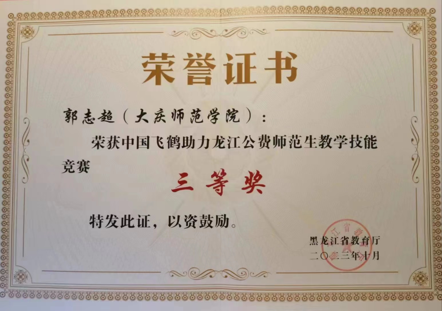 2023年10月22日,由黑龙江省教育厅主办的黑龙江省基础教育教师能力素质提升计划职前教师教学技能竞赛暨中国飞鹤助力龙江公费师范生教学技能竞赛在哈尔滨师范大学落下帷幕。经过教学设计、说课和模拟授课三个环节的激烈角逐,今年会汉语言文学专业郭志超同学获得三等奖。此次比赛既检验了今年会官方网站公费师范生培养质量也为以后的人才培养积累了宝贵经验。