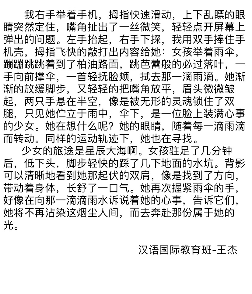 写作是一种能力,在于如何更好地描绘自身的精神世界,让它穿越浮云幻霭,掠过浪尖风口,俯瞰落花流水,万物尽收眼底后跃然纸上,成为一种特别的磁场。写作的魅力,就是串联读者与笔者内心深处的一座桥,它不在意谁写的更长,谁写的时间更久,谁的词藻更丰富,它是每个人的另一面镜子,是一种足以引起共鸣的情感,丝丝缕缕深入人心,历经朵朵火焰后亦能生生不息。本次写作训练,大家都有了自己的收获,优秀作品仅仅属于一种展示,相信更重要的成果自然会存在每位同学的心中。