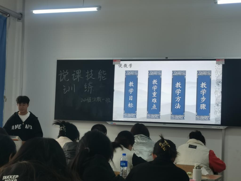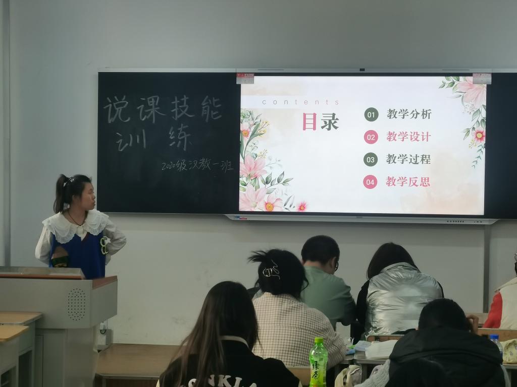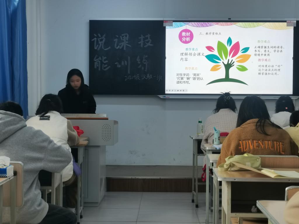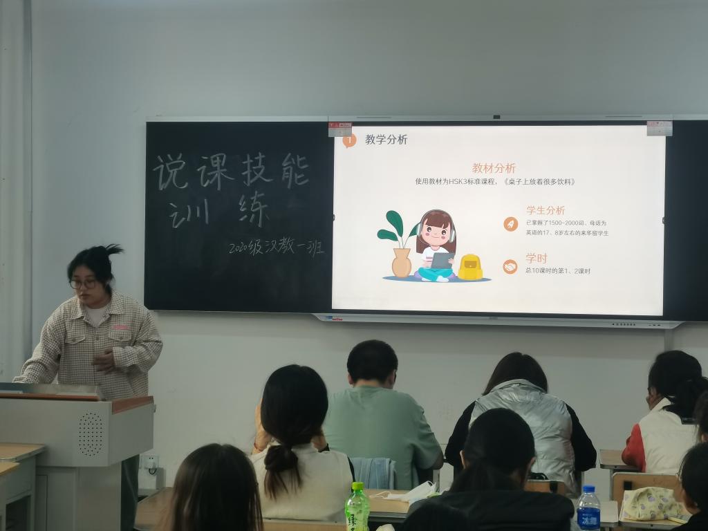 说课技能训练是汉语国际教育专业“五项基本功训练”的一项重要内容。本学期共开展了六次活动,说课内容选自《HSK标准教程》《发展汉语》《汉语教程》等国内外通行的对外汉语教材。同学们在老师的指导下,对所要说课的内容进行深入研究和准备,全面把握所教内容的教学要点、难点和重点,进行教学设计,从而不断改进和完善教学方法,进一步提升同学们的对外汉语专业素养和教学能力。