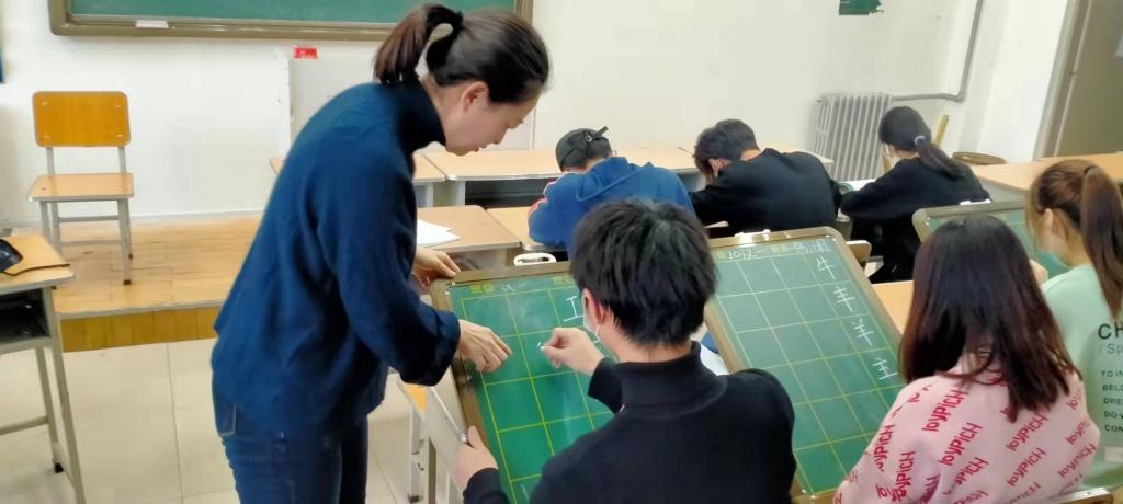 师范生的汉字书写训练活动以钢笔字和粉笔字为主,依据强化学生写字姿势、写字规范的训练目标,开展以写字姿势、执笔姿势、以及田字格中的抄写姿势为主体的训练内容。在训练过程中,学生们围绕汉字书写具体格式要求,在硬笔字帖和小黑板上积极投入的进行规范书写。针对同学们书写过程中出现的运笔不规范,字体时大时小等系列问题,两位指导教师依据汉字书写规则,以学生实际水平为基准,详略得当的帮助学生改正自身书写缺陷。经过系统专业的练习以及老师的悉心指导,学生们在每一阶段粉笔字和钢笔字的书写训练中得到了显著提升,小黑板和硬笔字帖上不断变化的汉字一并见证了同学们的勤劳付出与实际进步。