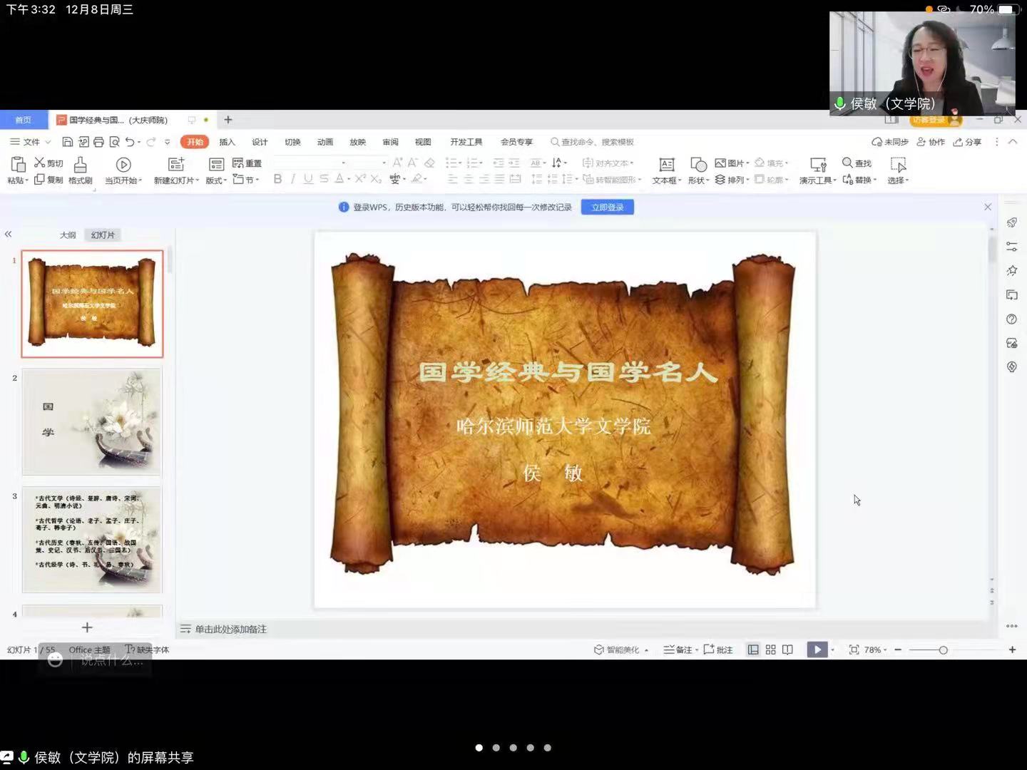 为让广大师生品读国学经典、感受国学魅力,2021年12月8日,今年会官方网站在腾讯会议上开展了国学经典与国学名人讲座,本次讲座特邀哈尔滨师范大学今年会官方网站院长侯敏教授主讲,今年会官方网站教师、学生百余人参加。