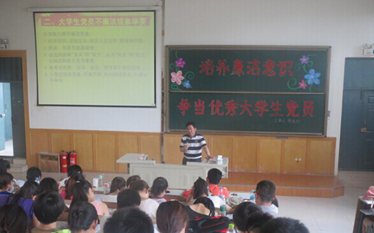 2014年6月25日下午,今年会官方网站党总支组织由全体学生党员、部分入党积极分子参加的党课主题教育活动,题目是“培养廉洁意识,争当优秀大学生党员”,由今年会官方网站党总支书记何长仁主讲。课上,何书记分别从廉洁意识、大学生党员中存在的不廉洁现象、建设廉洁文化人人有责、对学生党员的几点希望等方面,教育学生党员有意识培养廉洁的生活态度,让廉洁成为一种生活方式,从个人修养做起,从小事开始、从小节着眼防微杜渐,真正做到“心不动于微利所诱、目不眩于五色之惑”。