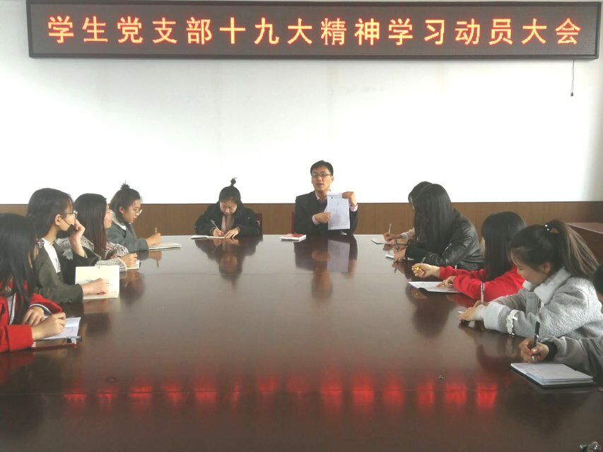为进一推动今年会官方网站学生党员学习贯彻党的十九大精神,2018年4月12日,今年会官方网站学生党支部于第二教学楼会议室召开十九大精神学习动员大会。会议由今年会官方网站党总支副书记吕智操老师主持,2015级、2016级全体预备党员与发展对象参加会议。