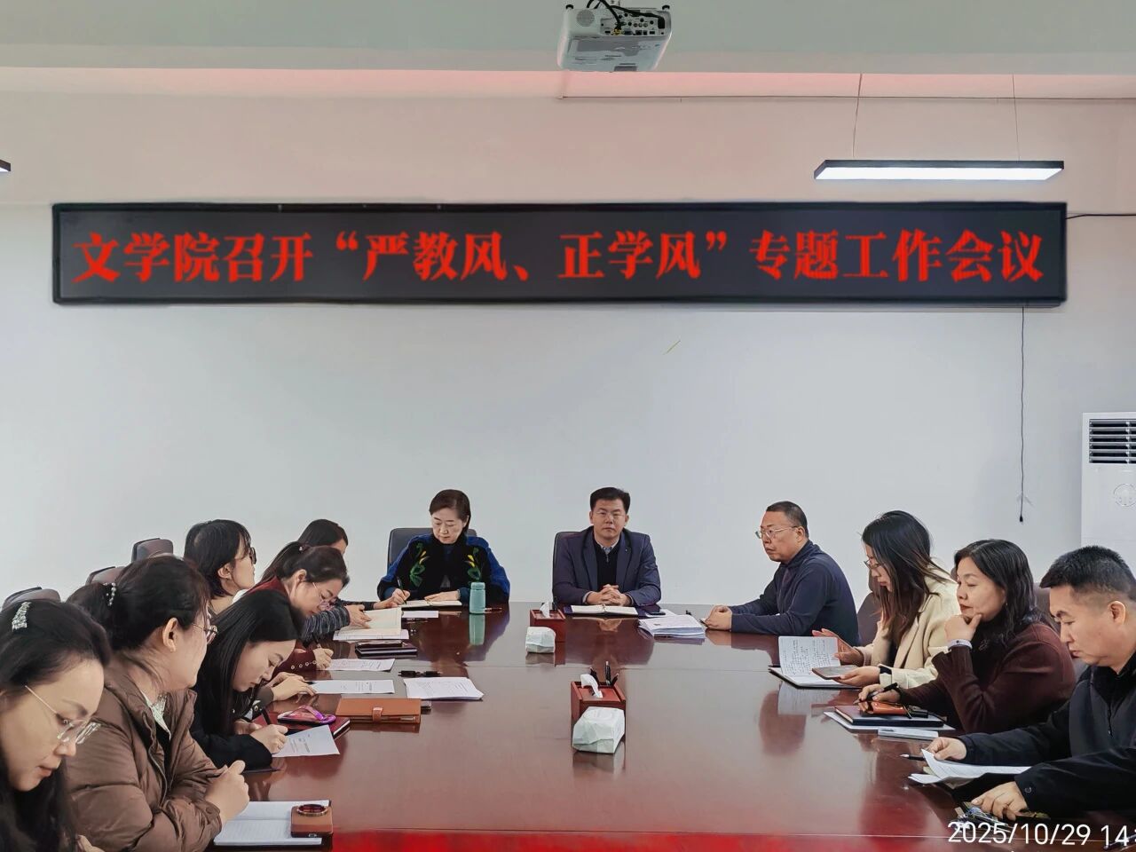院长赵丽聚焦“正教风”作重点讲话,提出三项具体要求:一是强化责任意识,教师需严格遵守教学规范,确保课堂教学质量;二是创新教学方法,结合文学学科特点激发学生学习兴趣;三是加强师德师风建设,以高尚师德引领学生成长。