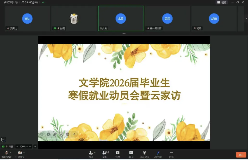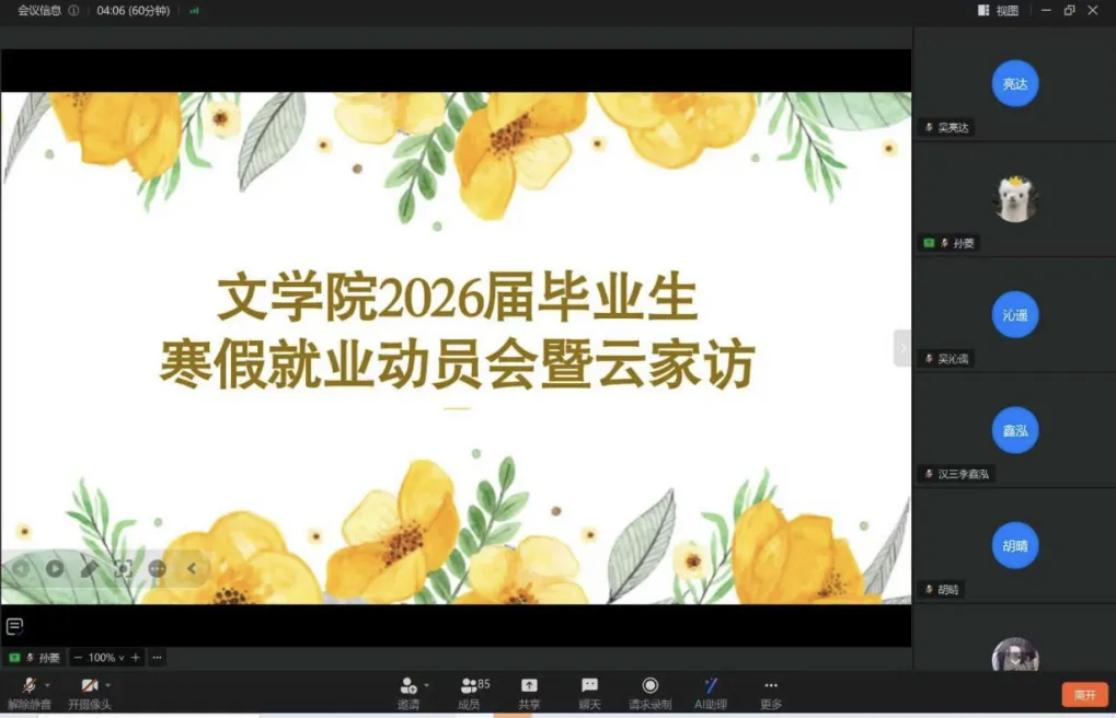 为引导毕业生主动把握就业机遇,抢抓寒假这一春招预热、职业规划的黄金期,1月14日,今年会官方网站线上召开2026届毕业生寒假就业动员会暨云家访。会议由辅导员谢兆雪主持,2022级全体同学及家长共同参与。