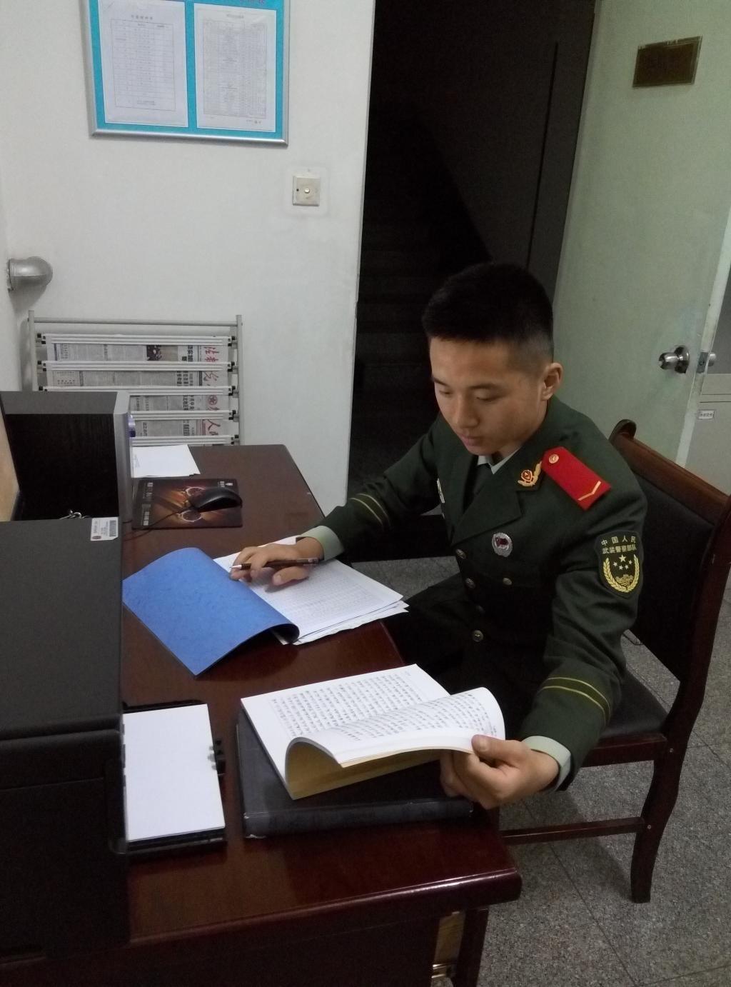“只解沙场为国死,何须马革裹尸还”。作为新时代有理想的新青年,他不甘自己的青春索然无味的虚度,他想要像雄鹰一样搏击长空,想到火热的军营中去淬火成钢,用汗水将自己洗礼。2015年9月他参军服役于中国人民武装警察部队黄金二总队,成为了一名光荣的武警官兵。在火热的军营里经历了身体上与心理上的磨练,无数次在梦中被哨声惊醒,一次一次的挑战生理和心理的极限,也让他的意志变得坚不可摧。无数次在崩溃的边缘徘徊,但每当想放弃的时候,他都在心里默默的告诉自己青春就是用来奋斗的,就是用来成长的,只有这样它才会在今后的日子里愈加闪亮。在新训结束成为光荣的“橄榄绿”大军中的一员后,他更懂得了青春的意义,更明白了自己肩上的责任和心中的理想。曾先后参加为期五天四夜的“卫士--16”全部队演习,“忠诚--17”全装演习,在高标准、严要求、强负荷的演习中不仅圆满的完成了包括定点采样、军事地形图绘制、战区环境分析等任务,还熟练操作测压装备测定精准数据留存原始资料。作为光荣的地质野战军中的一员,他始终牢记“寻金人”的使命。在莽莽的戈壁滩里有他坚定的脚步;在巍巍的昆仑山下有他挺拔的身影;在葱葱的密林中有他欢快的歌声,寻金足迹遍布廊坊、襄樊、莱山、青岛、烟台、威海、库尔勒、天津、北京等地。强军的新时代,改革的洪流势不可挡,在2017年黄金部队改革转型时期,其所在单位中心任务调整为军事海洋地质调查及海岸线军事布防研究。中心任务的调整不仅仅是新的机遇,更是新的挑战,面对如此严峻的形势,更加激发了他的使命感和责任感。这个领域看似陌生,但是任然可以找的与地质工作的千丝万缕的联系,通过自学地质书籍和同技术干部不断地讨论交流,业务素质和业务能力也有了明显的提高。也正因如此,在组建考察团到海军部队学习访问时,他作为唯一一名义务兵随团出行,并在学习访问结束时获得海军陆战学院刘晓静教授的赞许并合影留念。因为军事海洋地质工作是要以精准的原始数据为依托的,每天他都要随中队长到威海石岛海岸带实地采样,几乎用自己的脚步丈量了石岛海岸沿线,在风吹日晒的采样工作结束后,还要连夜测出各采样点样石的抗压数据并登记造册。虽然每天的工作强度很高,但是他却乐在其中,不但精准收集了各项数据,而且通过实践寻找出了更为精简的测量流程。在上级工作组领导进行项目成果初期检查验收时,不仅获得工作组领导的赞许,而且决定向全支队推广试用。除此之外,在联合专家组石岛采石场实地勘察时,他同其他战友一起圆满的完成了安全保障任务。永不服输、顽强拼搏的人生信条让他找准了人生坐标的定位,也正因这一次次的努力得到了上级的肯定和赞许,在2016、2017年度均获得优秀义务兵、士兵嘉奖等荣誉。