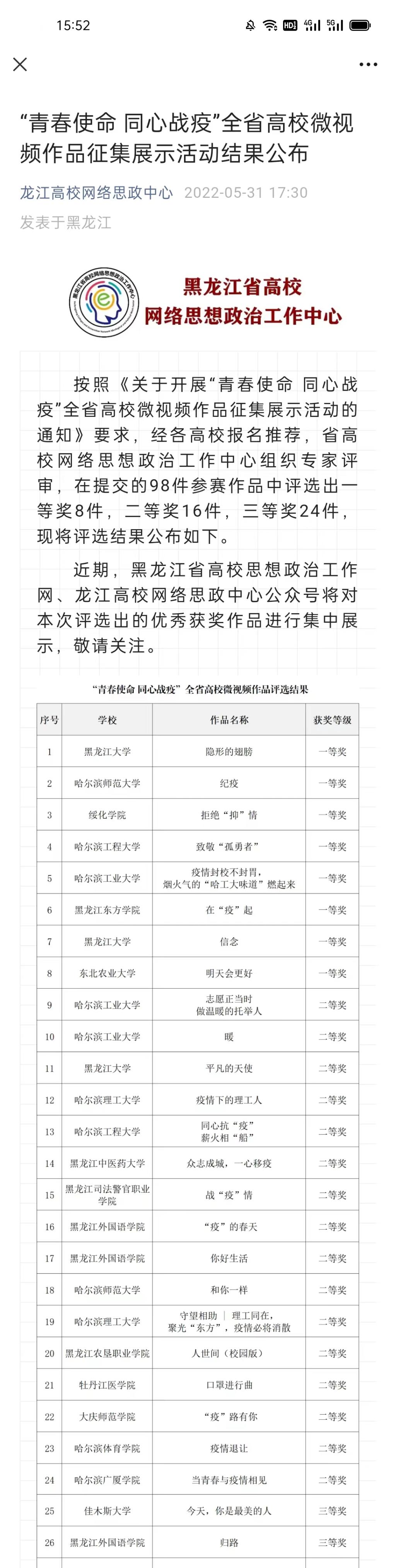 黑龙江省高校网络思想政治工作中心于2022年4月面向全省高校举办疫情防控优秀微视频作品征集展示活动,旨在用生动的画面、感人的细节,描绘高校师生众志成城、同心抗疫的动人画卷,展现高校师生认真学习贯彻习近平总书记关于疫情防控工作的重要指示批示精神,严格落实省委、省政府和省委教育工委、省教育厅的要求部署,主动担当作为,打赢疫情防控阻击战的坚定信念和积极行动。