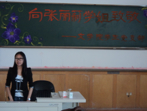 此次活动由汉语言文学专业学生党支部书记刘丽主持。在观看纪实片之前,刘丽做了简短的演讲,表达了自己对张丽莉的敬佩之情,结合党员的先进性教育,向学生党员宣传了党的十八大精神。随后,播放了《张丽莉》纪实片,大家认真观看,并做了记录。通过播放纪实片,全体学生党员接受了张丽莉无私奉献精神的再教育。