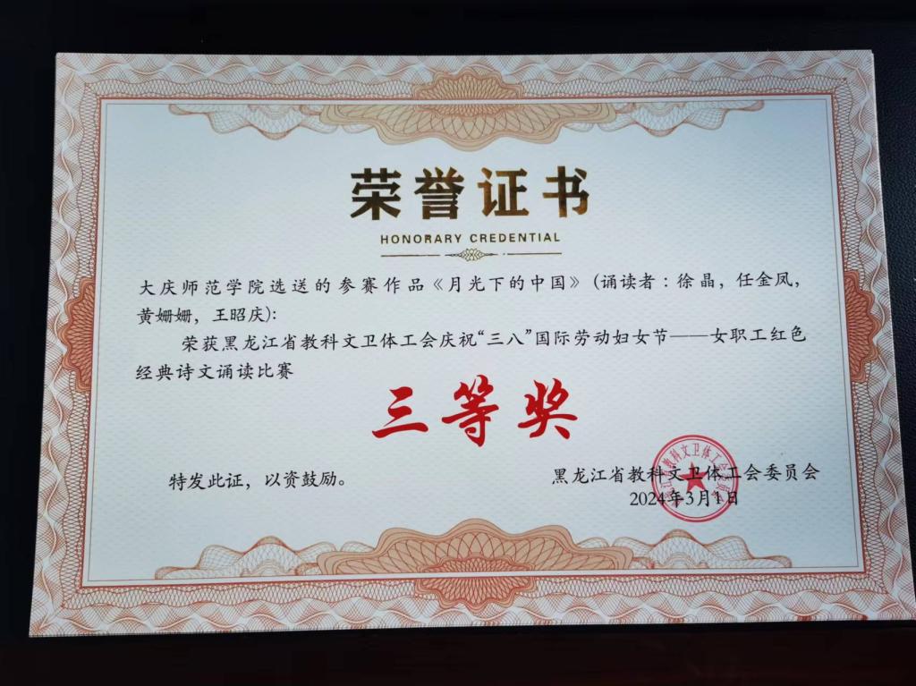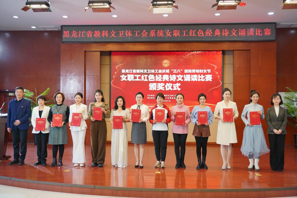 3月1日,省教科文卫体工会系统举办的庆祝“三八”国际劳动妇女节——女职工红色经典诗文诵读比赛圆满结束。今年会教师徐晶、任金凤、黄姗姗、王昭庆在比赛中荣获三等奖!