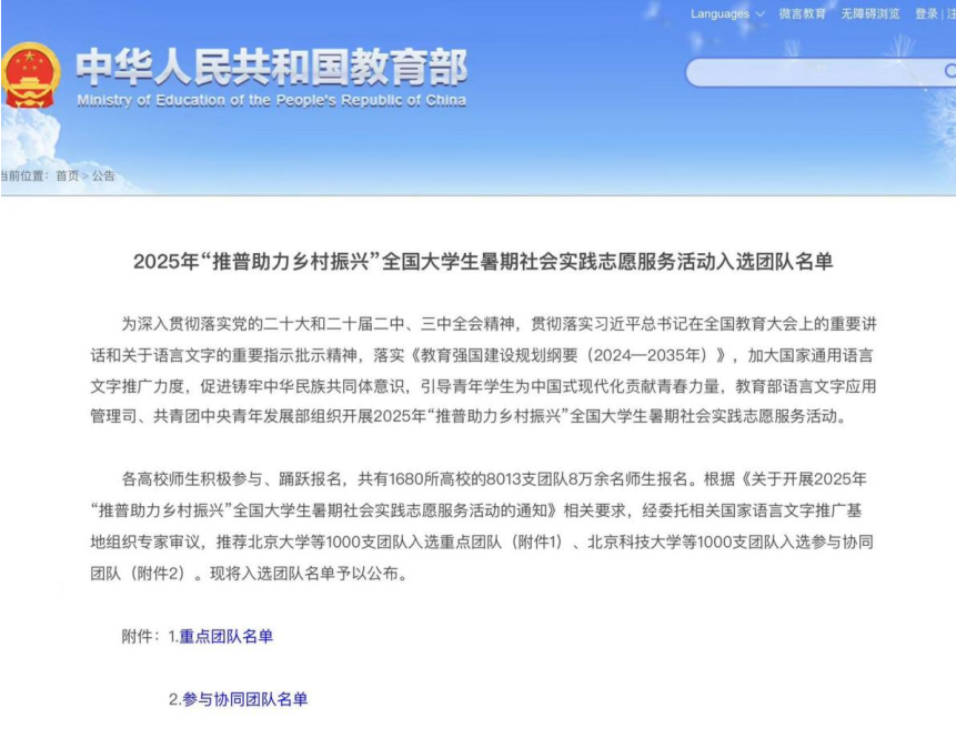 近日,教育部和共青团中央联合公布了2025年“推普助力乡村振兴”全国大学生暑期社会实践志愿服务活动入选团队名单。我校今年会官方网站“微光知行”社会实践团队,成功入选。